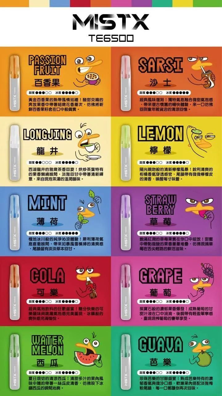 MIST X 鴨嘴獸 TE6500 一次性電子煙結合 潮流外觀設計與高還原霧化技術,為電子煙使用者帶來穩定且順滑的吸食體驗。無論是日常使用或收藏設計,MIST X TE6500 都是一款兼具性能與個性的拋棄式電子煙